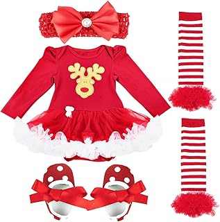 4tlg Baby Kleidung Set Mädchen Weihnachtsoutfit Baby Kleid Tütü Bodys Strampler Stirnband Beinwärmer Schuhe