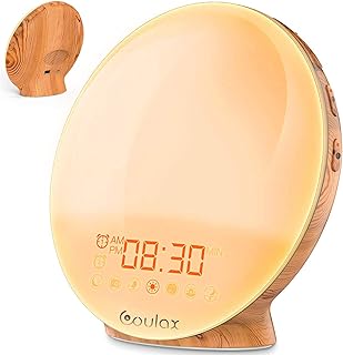 COULAX Lichtwecker Holzoptik Wake Up Licht Wecker Sonnenaufgang Sonnenuntergang Simulation Tageslichtwecker mit Zwei Alarmen 20 Helligkeit 7 natürlichen Klängen UKW-Radio Erwachsene Kinder